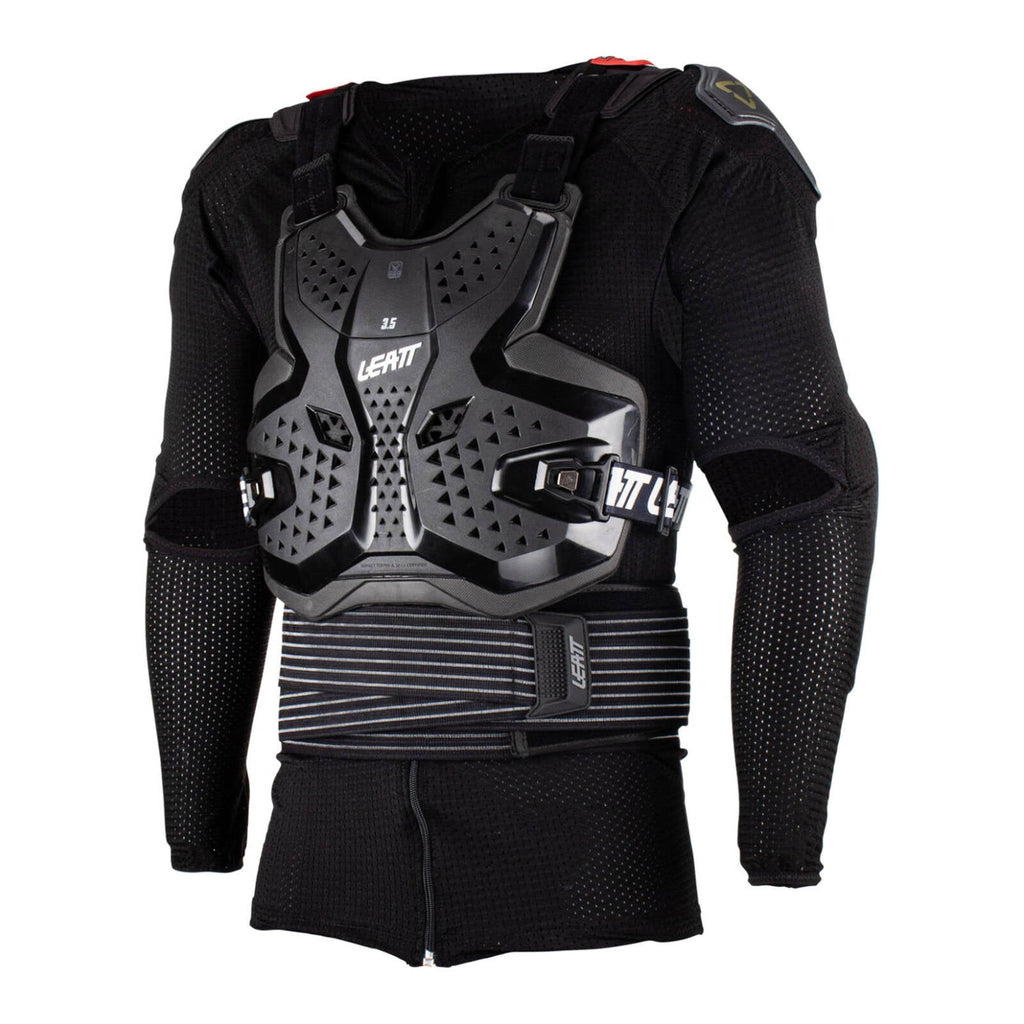 The 3.5 Body protector comes in 2 pieces. There is a zip-up compression suit with built-in shoulder and elbow impact protectors and also a height-adjustable kidney belt. Then a hard-shell CE-certified chest and back impact protector is used over the top.